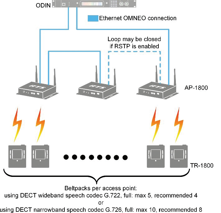 La estructura celular de ROAMEO puede cubrir un área amplia con audio superior y roaming continuo entre las celdas individuales. Los usuarios pueden expandir fácilmente el área de cobertura agregando puntos de acceso, mientras que los beltpacks inalámbricos adicionales se pueden abordar directamente como parte de un sistema de intercomunicación de matriz RTS con cable.