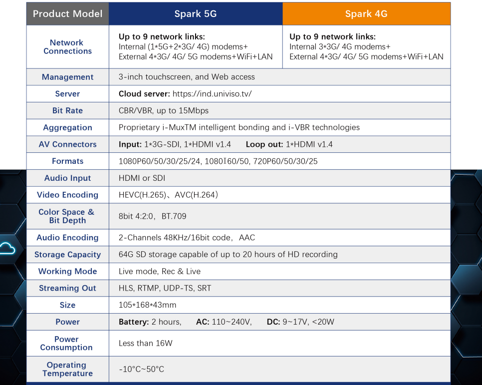 La serie Spark es un codificador de enlace de transmisión de audio y vídeo HD miniaturizado, de baja potencia y baja latencia de la familia de productos UNIVISO. Que integra un algoritmo de codificación de vídeo H. 265/265 de calidad de transmisión y tecnología inteligente de agregación multienlace. Puede ser ampliamente utilizado en los campos de conexión de noticias en vivo a larga distancia, transmisión de noticias y producción remota de programas, etc.