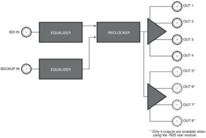 El SRA-8802 se puede utilizar como DA 1 × 8, utilizando el módulo trasero estándar –R2, 10 BNC o como DA 1 × 4 cuando se combina con el módulo trasero –R2S. Esta configuración permite hasta 20 DA 1 × 4 en un solo frame openGear®, utilizando 20 tarjetas.