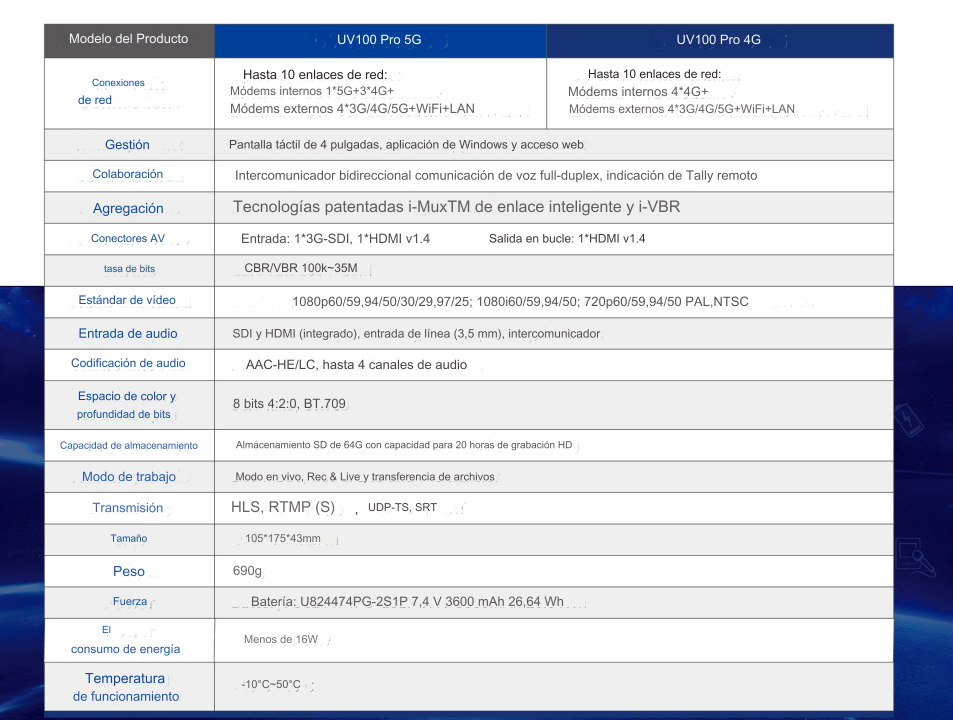 El codificador de unión HD portátil UV100 Pro es un terminal compacto de transmisión en vivo de audio y video HD de la familia de productos de transmisión en vivo UNIVISO con bajo consumo de energía y bajo retardo de tiempo. Integra un algoritmo de compresión de vídeo HEVC/AVC de calidad de transmisión y una tecnología inteligente de agregación multienlace de hasta diez agregaciones. Se puede integrar con el soporte de cámara cold shoe o con el beltpack carry-on.